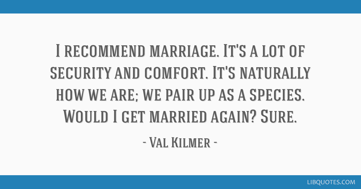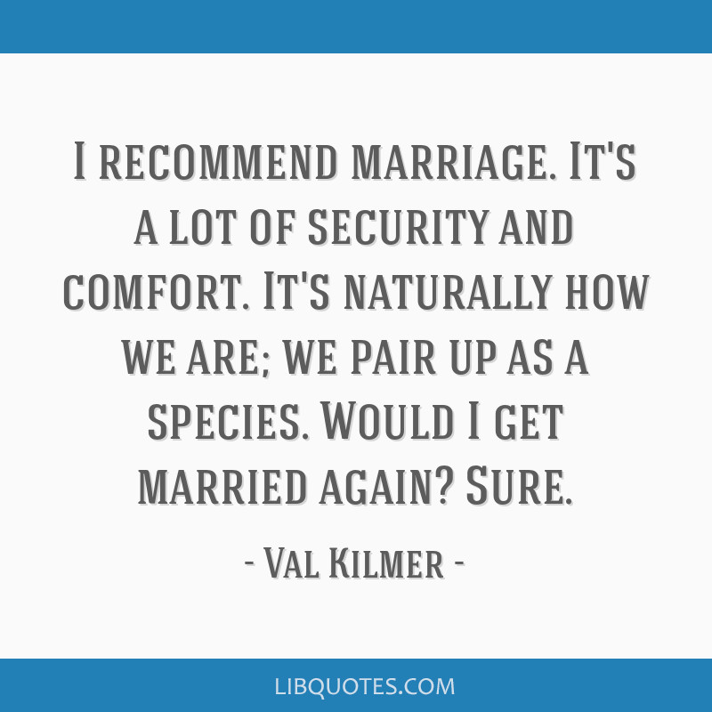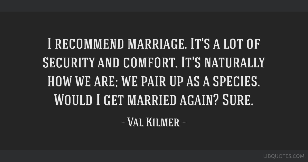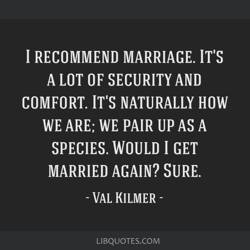 I recommend marriage. It's a lot of security and comfort. It's naturally how we are; we pair up as a species. Would I get married again? Sure.