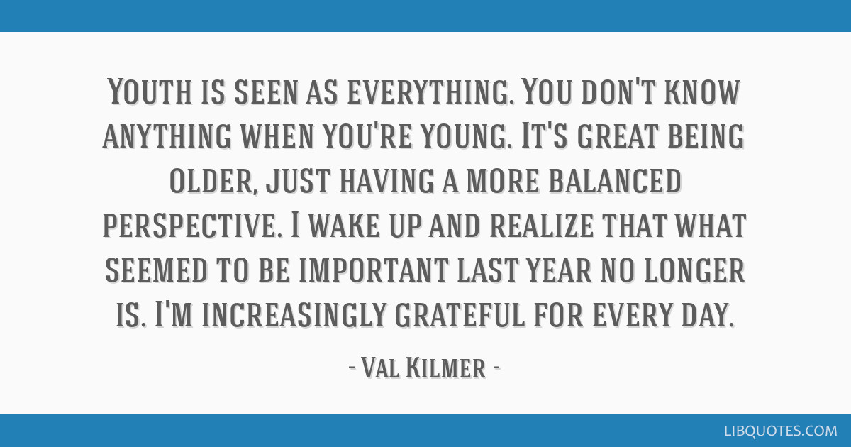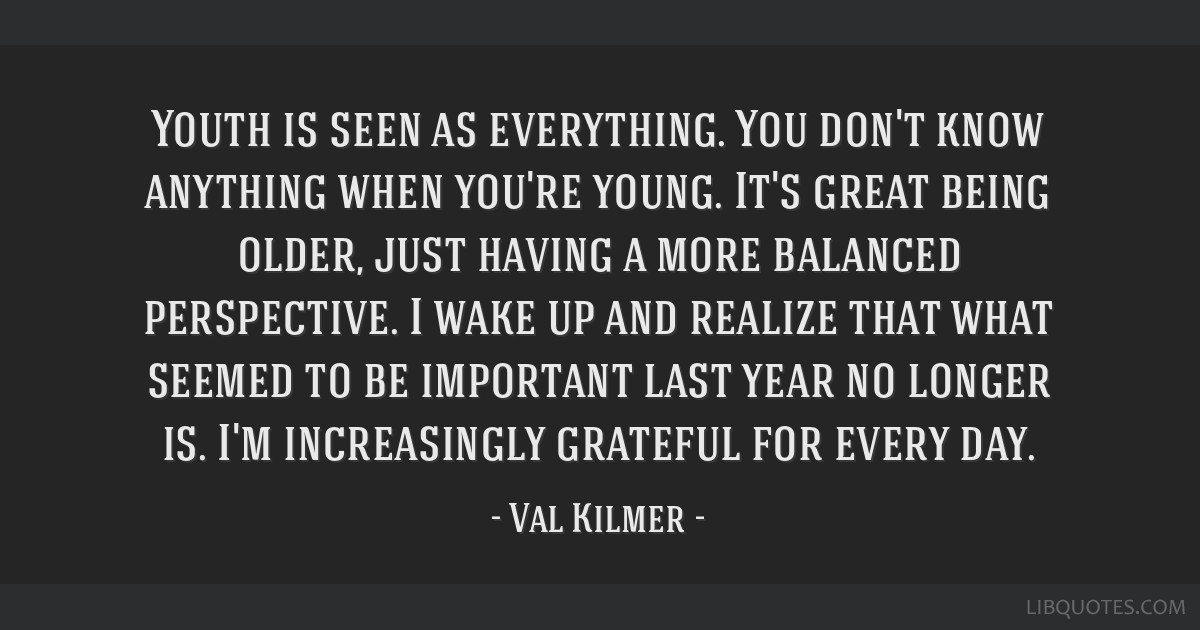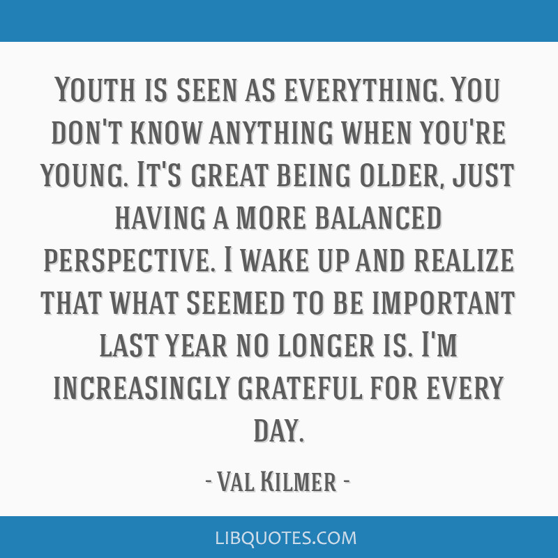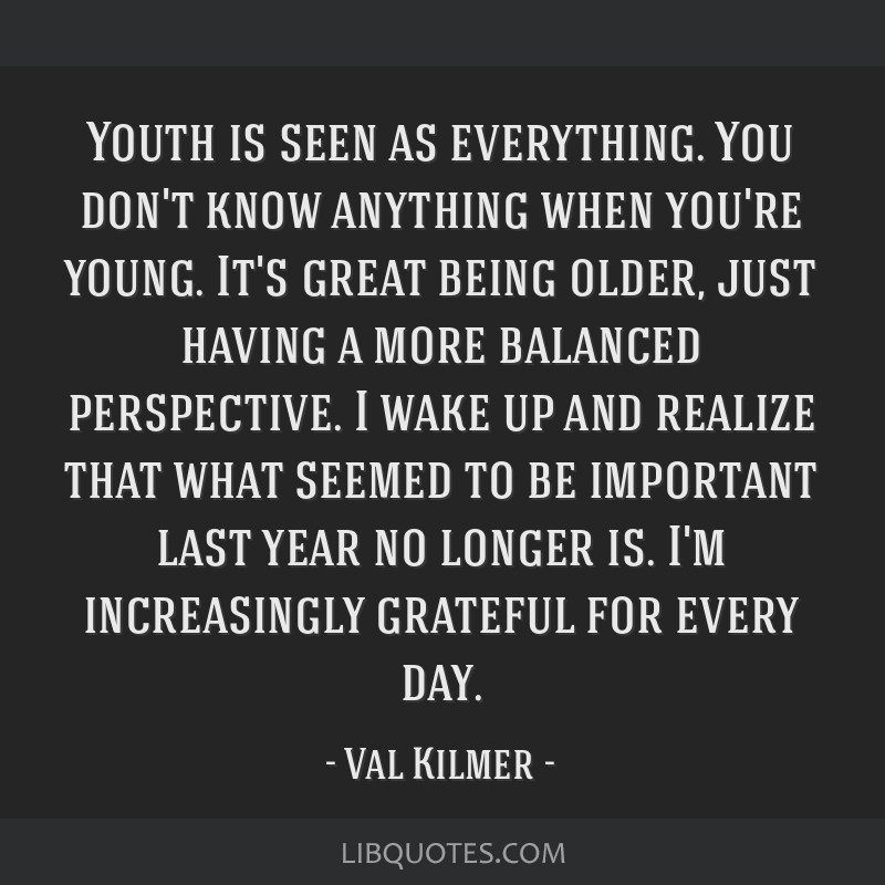 Youth is seen as everything. You don't know anything when you're young. It's great being older, just having a more balanced perspective. I wake up and realize that what seemed to be important last year no longer is. I'm increasingly grateful for every day.